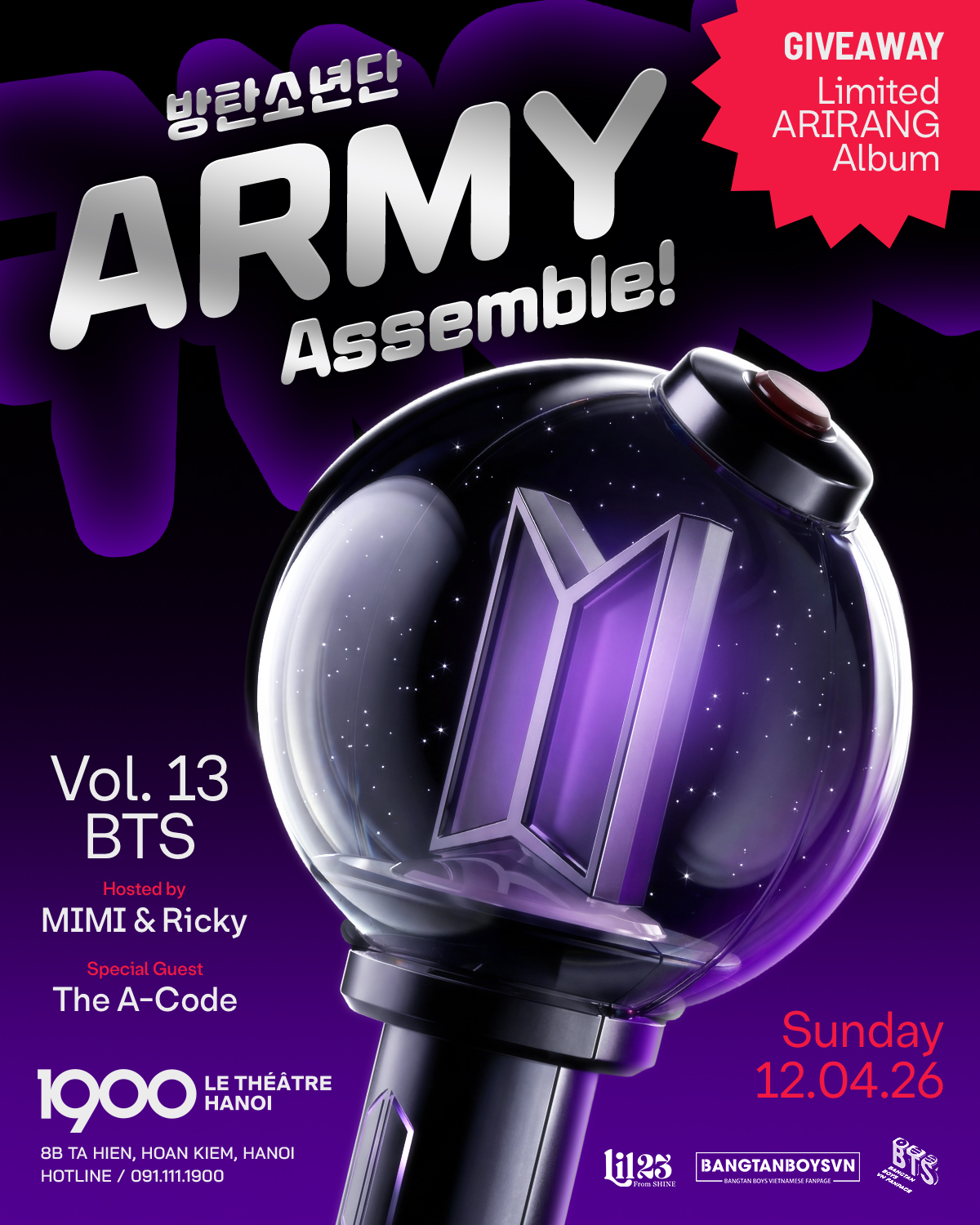 For the very first time, 1900 is teaming up with The A-Code, Bangtan Boys VN Fanpage, BANGTANBOYSVN, and Lil23 From SHINE to bring you the ultimate ARMY-only party!