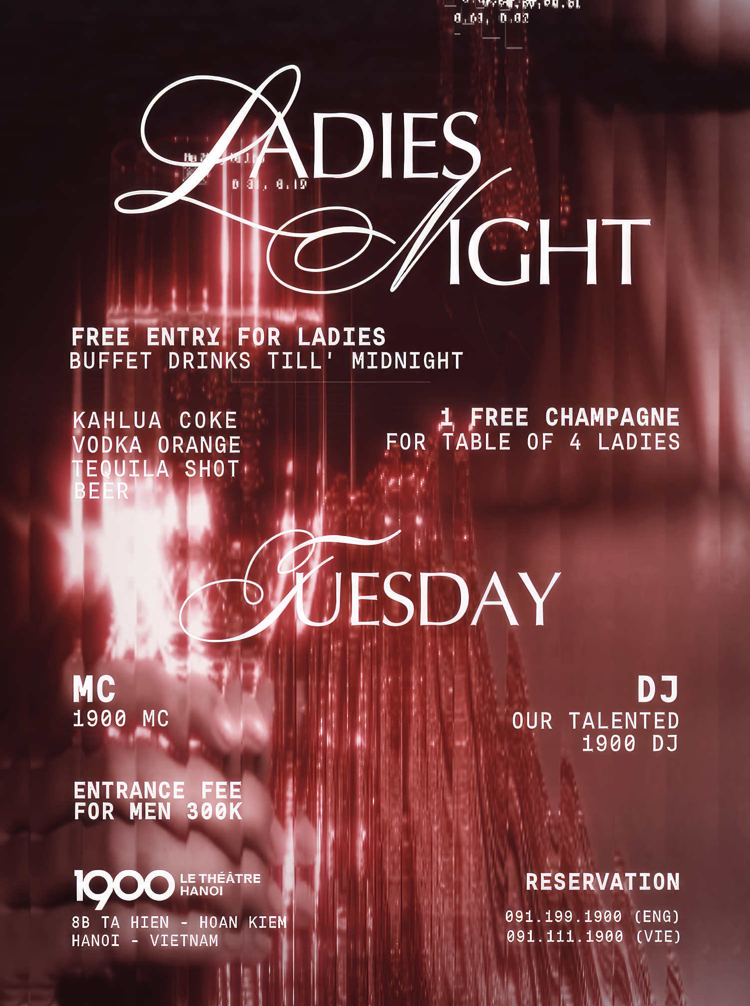 Các bạn nữ sẽ được miễn phí vé vào cửa trước nửa đêm. Ngoài ra, các bạn còn có thể uống cocktail thoải mái tại quầy bar với chương trình Buffet Drinks cùng buffet đồ uống và ưu đãi tặng 1 champagne cho bàn 4 nữ 💋💋💋. Hãy cùng hội bạn cháy hết mình vào tối thứ Ba với dàn Resident DJs chất lượng của 1900 nhé!