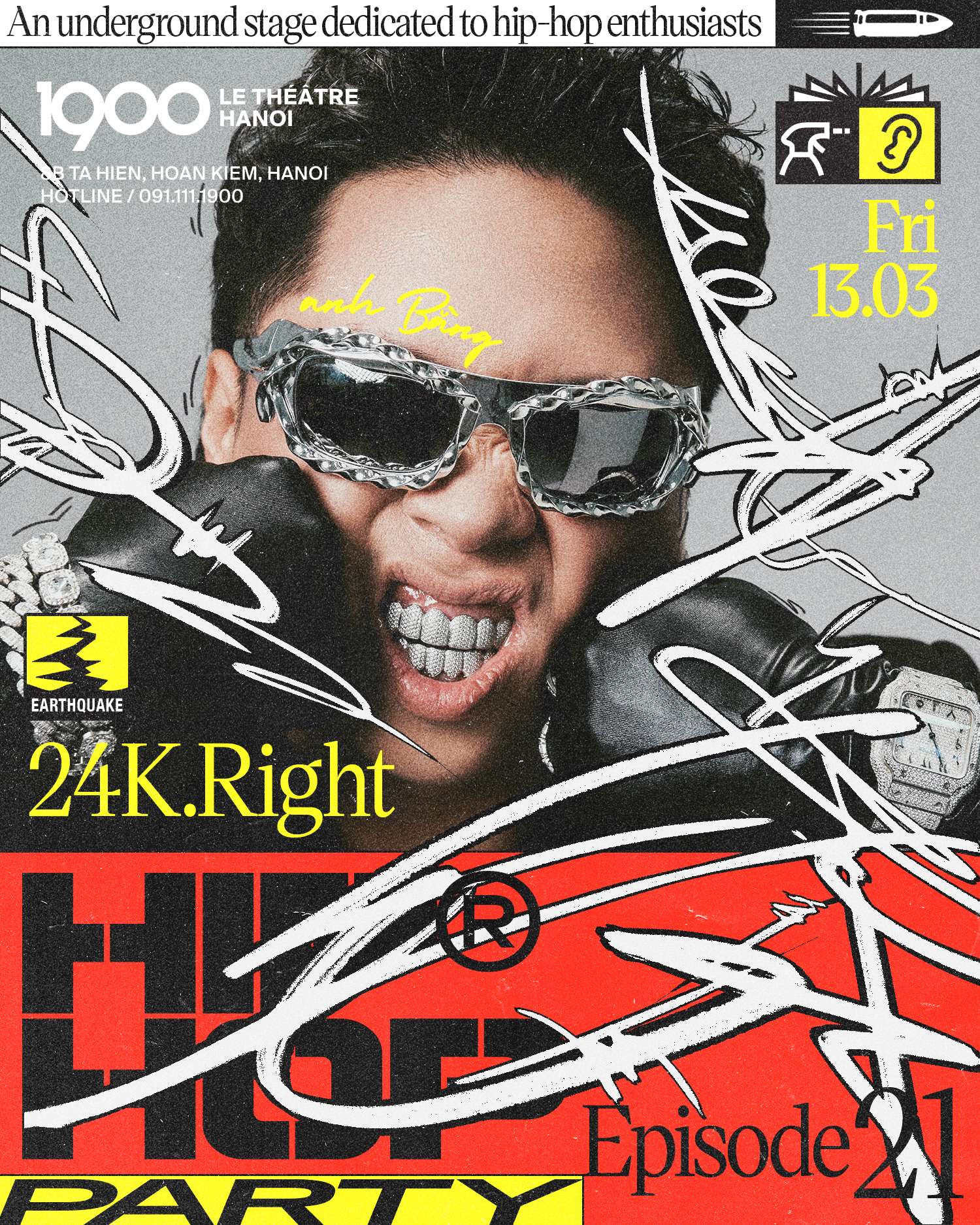 Với nhiều bản hit triệu view như “Anh Tên Là”, “Hai Thằng Bịp”, “Một Nửa Sự Thật”, “Đừng Nổi Cáu Với Anh”,… cùng những fan tại 1900 chắc chắn sẽ thuộc không sót câu nào – hứa hẹn sẽ là một đêm nhạc bùng nổ chất Hip Hop. Hãy cùng chờ đón những màn trình diễn đặc biệt mà Anh Bằng 24k.Right sẽ đem tới dành tặng cho fan Hà Nội nhé!!